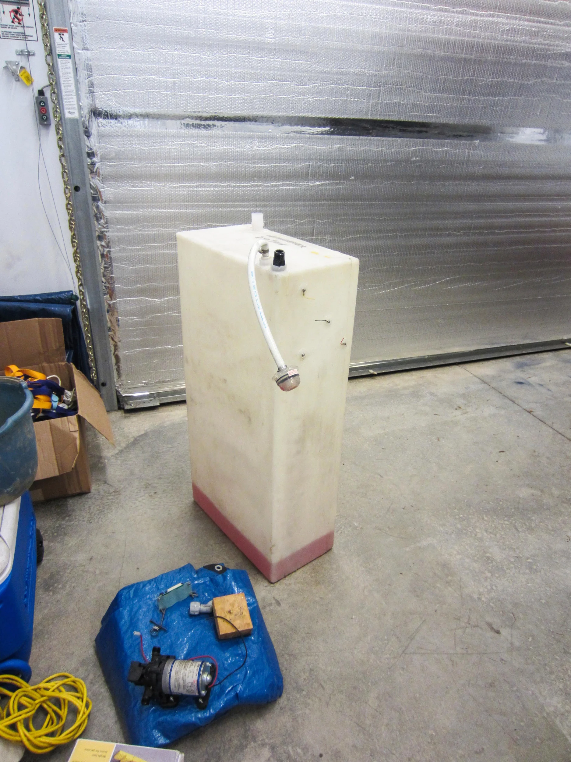 Our freshwater tank. The pink liquid is RV specific antifreeze that we used to prevent the tank from freezing over winter while it was stored.